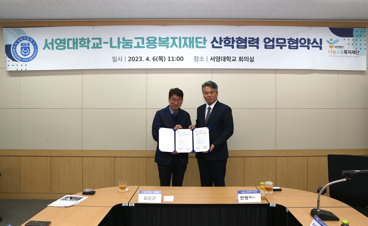 O. 서영대학교 회의실에서 진행된 협약식은 서영대학교 부총장 김순곤, 학생취업처장 김명재, 사회복지행정과 학과장 김효선, 사회복지행정과 권지혜, 김민철 교수 등 서영대학교 관계자와 나눔고용복지재단 이사장 현명진, 이사 전영석, 나눔평생교육원장 손용민, 고산종합사회복지관장 장재임 외 재단 관계자등 총 10여명이 참석하였다.