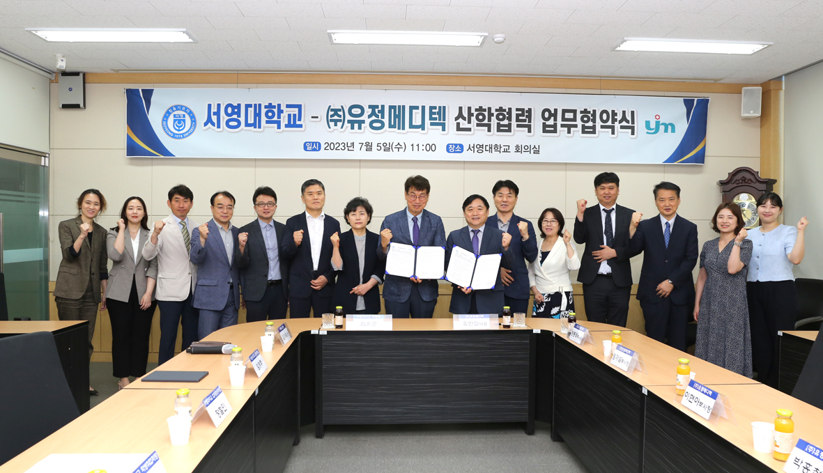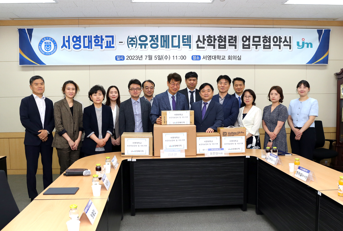 O. 우리대학(총장 김정수)은 6월5일(수) ㈜유정메디텍과 보건전문인력 양성과 바이오 생물테러대응 협업을 위한 업무협약을 체결했다. 서영대학교 회의실에서 진행된 협약식에는 서영대학교 부총장 김순곤, 입학홍보처장 장철인 외 각 부처 처장단과 임상병리과 학과장 이지웅 및 학과교수를 비롯한 관계자와 유정메디텍 대표 유만길, 파주시 보건소장 임미숙, 파주타임즈 대표이사 윤관호 외 업무관계자가 참석하였다. O. 상호 협력 체계 구축을 위한 주요 협약 내용은 다음과 같다. 참여기업과 서영대 보건계열 학생 간의 의료기기 제품개발, 우수 의료인력 양성을 위한 프로그램 개발, 교수 현장 연수 및 학생 현장실습 지원, 산·학간 우수 인력 우선 공급, 실무 위주의 교육과정 및 학습교재 공동개발 등에 관한 사항이다. O. 이날 진행된 협약식에서는 ㈜유정메디텍에서 DOA 마약 진단 키트, 말라리아 진단 키트, 바이오 생물테러 관련 진단 키트, 체외진단기기 등을 임상병리과에 전달하는 기증식도 함께 진행되었다. 임상병리과에서는 이를 활용하여 기생충 및 혈액학 실습 교과목을 통해 말라리아 신속 진단 실무를 학습하고, 법의학 교과목을 통해 현재 많은 이슈가 되고 있는 마약 진단 검사에 대한 심도 있는 수업을 진행할 예정이다. O. 서영대학교 김순곤 부총장은 “서영대학교가 보건 특성화 교육기관으로서 헬스케어 분야를 선도하는 유정메디텍과의 업무협약을 통해 양 기관의 발전과 보건의료 및 관련 전문 연구 인력을 제공할 수 있는 기반을 확립하게 되어 기쁘게 생각한다”고 말했다. 이에 ㈜유정메디텍 유만길 대표는 “보건의료 분야에 아낌없이 투자하는 서영대학교와 협력하여 학생 현장실습 지원과 교육프로그램 공동 개발을 통해 우수한 보건의료 인력을 확보하고, 지식과 기술 교류를 통해 바이오 생물테러대응 및 지역사회 보건의료분야정책에 기여하고자 지속적인 교류 협력에 최선을 다할 것이다”고 말했다. 더불어 서영대학교 이지웅 임상병리학과장은 “현재 대부분의 의료기관 및 연구소에서 다수의 임상병리 전공자들이 각종 감염병 진단업무 및 바이오 생물테러대응 분야에서 종사하고 있는 상황이다. 오늘 진행된 유정메디텍과의 지속적인 협력으로 향후 R&D 분야에서도 주도적인 역할을 할 수 있는 인재양성을 위해 최선을 다할 것이다”라고 말하였다.