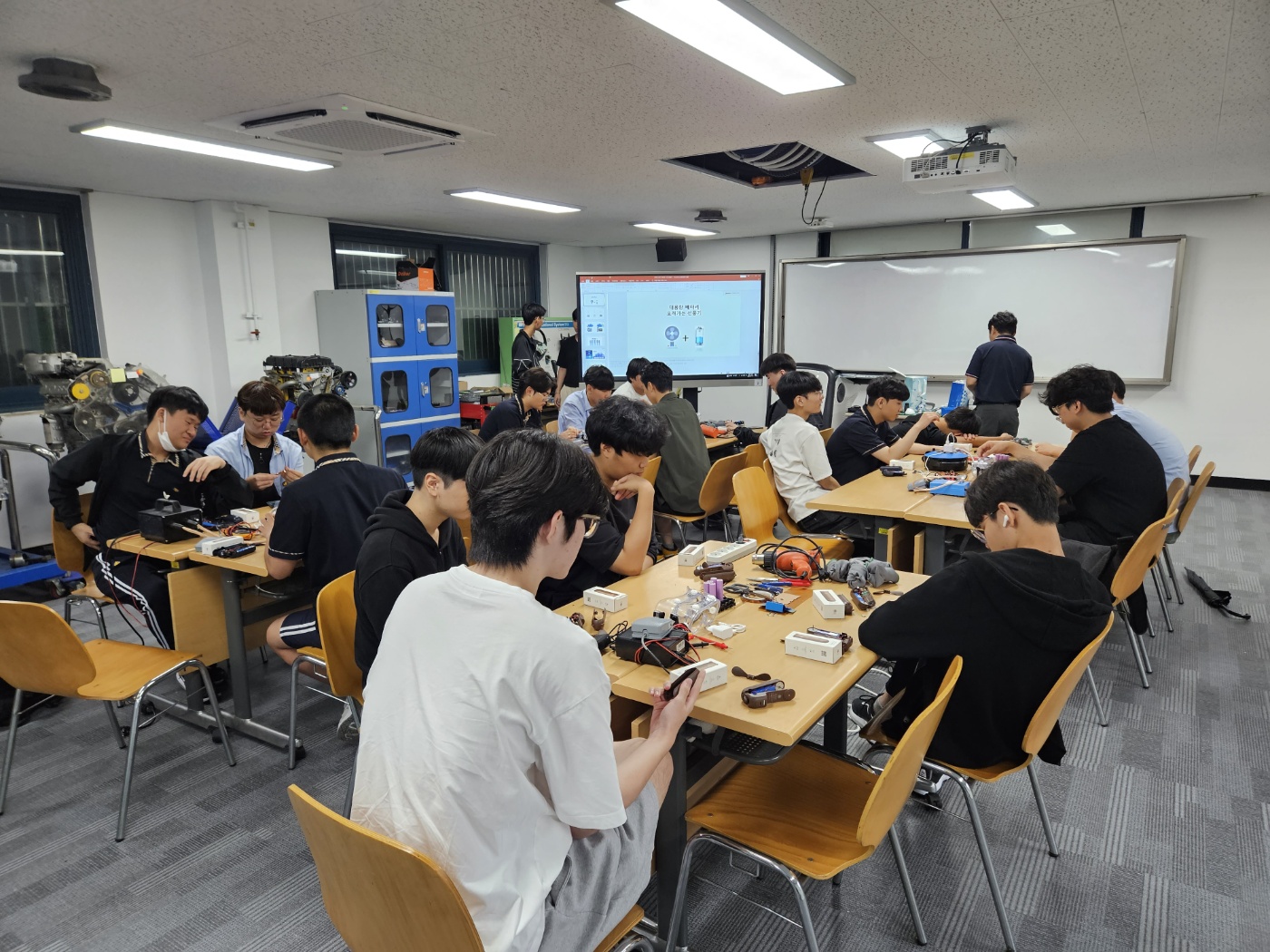 ○ 이번 교육에서는 학생들이 미래자동차분야 신기술을 접해볼 수 있도록 전기자동차 및 자율주행차 모듈을 직접 작동해보는 시간을 가졌다. 또 리튬이온 배터리를 활용한 휴대용 선풍기를 제작하며 전기자동차의 구동방식을 간접적으로 체험해 볼 수 있는 기회를 가졌다.