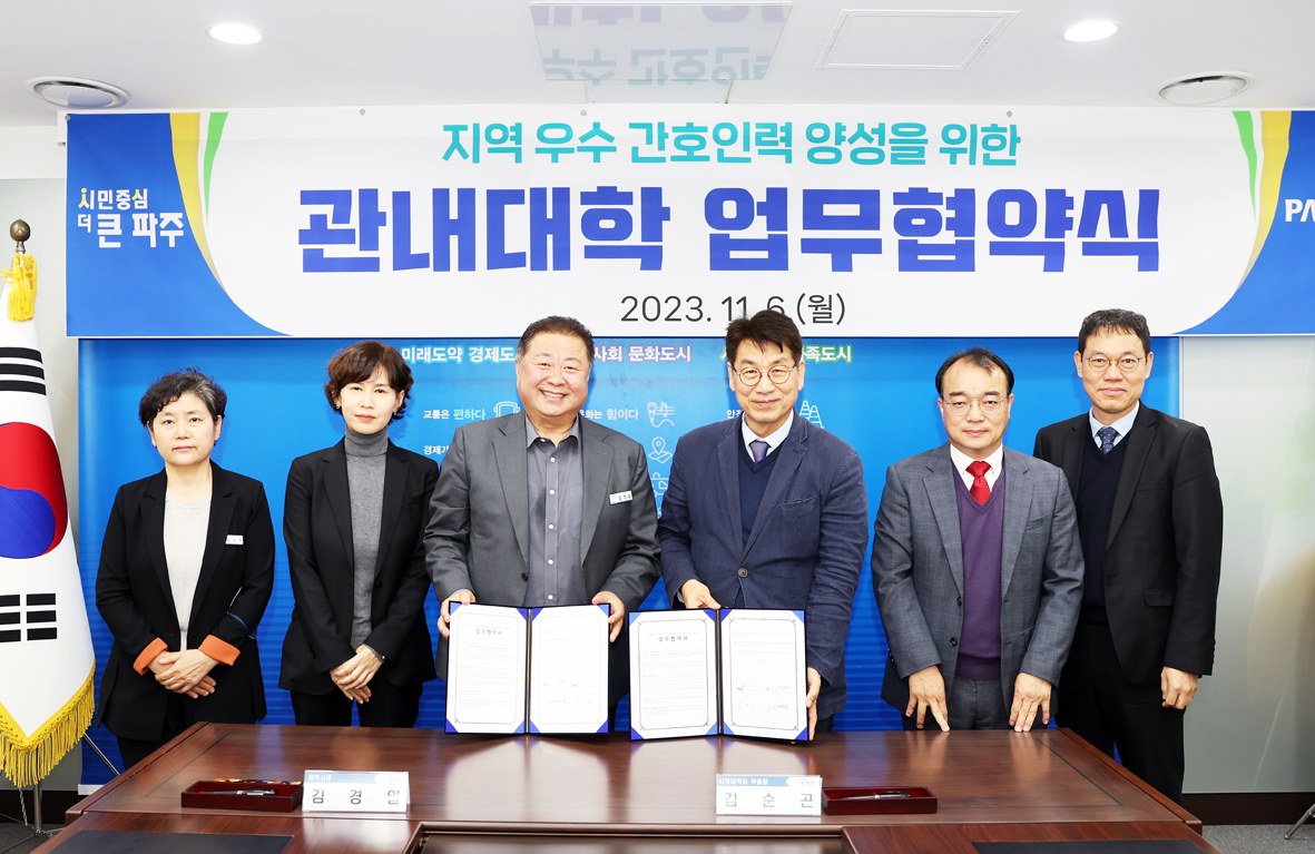 O. 우리대학(총장 김정수)은 11월 6일(월) 파주시(시장 김경일)와 서영대학교 파주캠퍼스 간호학과 분리모집 및 운영추진을 위한 업무협약을 체결하였다. 파주시청에서 진행된 업무협약식에는 서영대학교 부총장 김순곤, 입학처장 장철인 외 서영대학교 관계자와 파주시장 김경일 외 파주시청 관계자가 참석하였다.