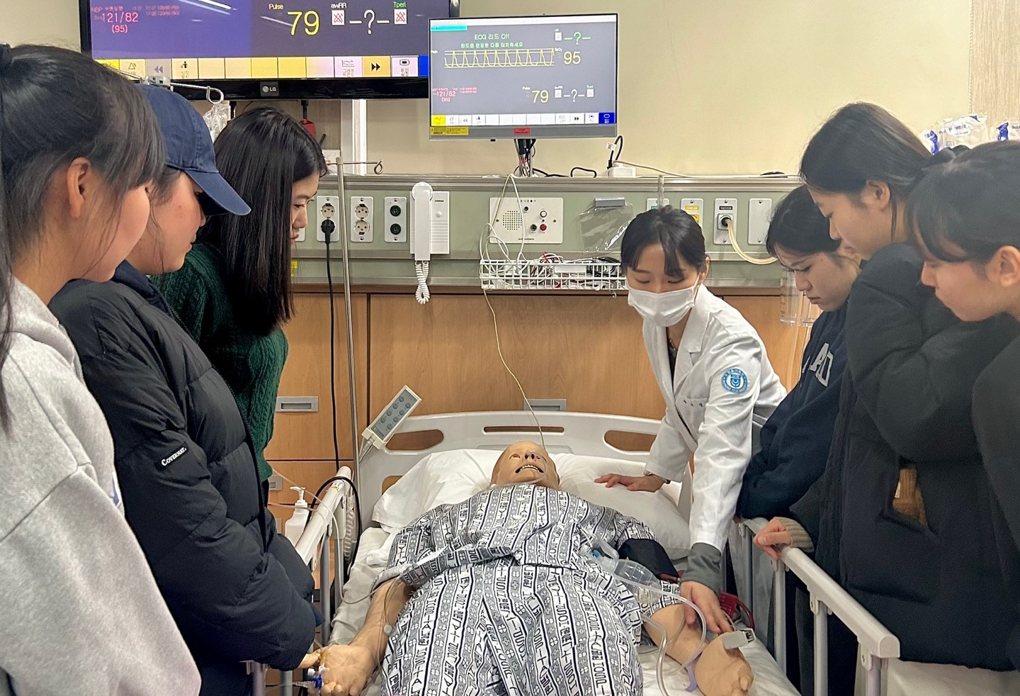 ○ 특히 간호학과 4학년 선배와 함께하는 멘토-멘티 활동으로 시뮬레이션 실습실에서 환자마네킹 모형과 실습용 의료장비를 가지고 실제상황을 재현해보며 간호사의 역할을 간접 체험했다.