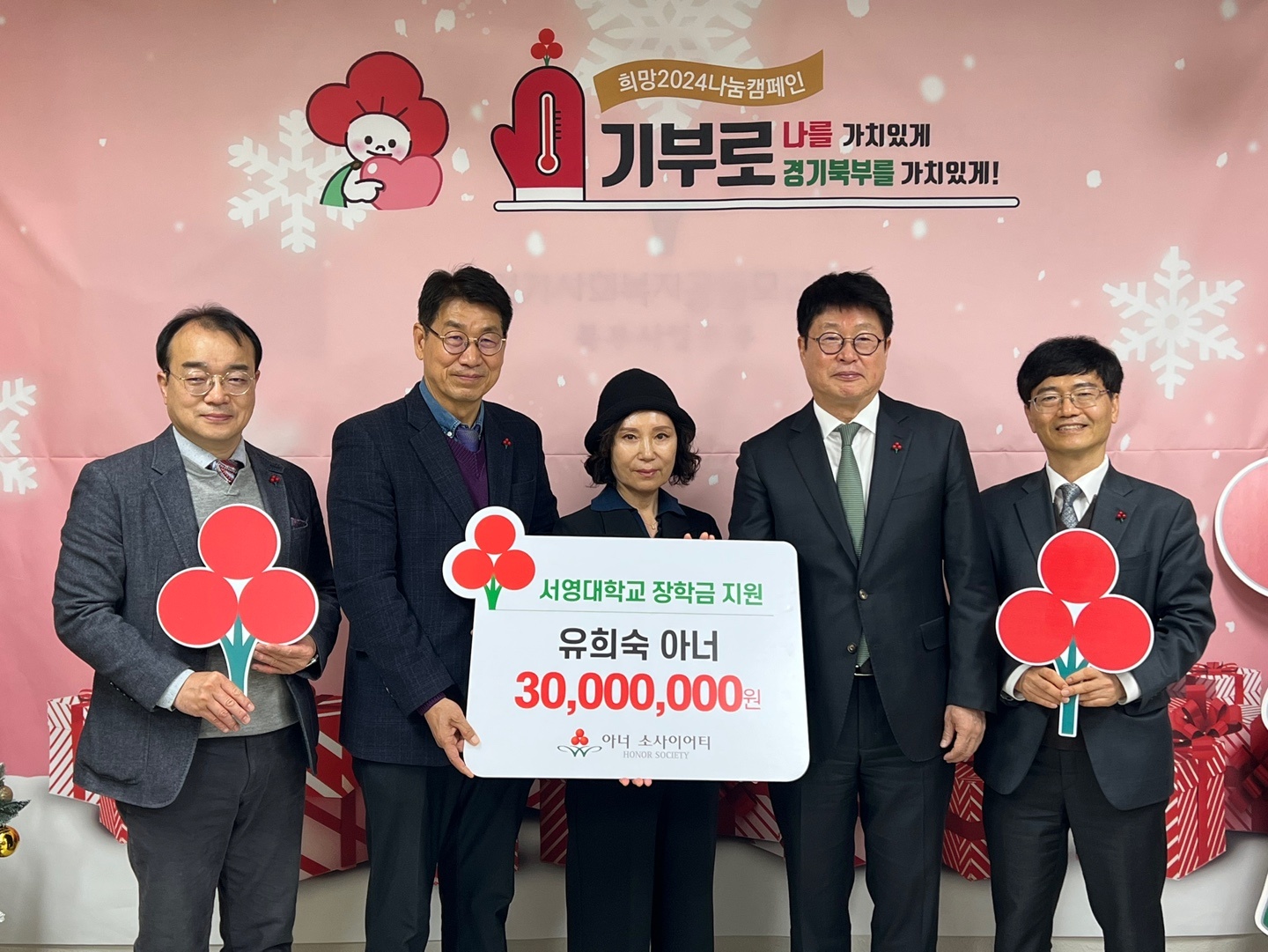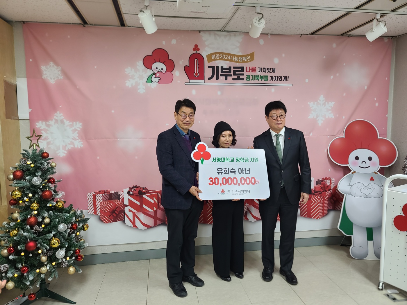 O. 이날 행사는 사랑의 열매 경기지회에서 실시하였으며, 우리대학 김순곤 부총장, 장철인 입학홍보처장, 유희숙 기부자, 권인욱 경기사랑의열매 회장, 노진선 경기북부사업본부장 외 관계자들이 참석하였다. 유희숙 기부자는 “평소 주변에서 어려운 가운데 학업을 통하여 자신의 미래를 준비하는 학생들에게 조금이라도 도움을 주고자 생각하였는데, 이번에 서영대학교와 좋은 인연을 맺게 되었다”라고 하면서 “어려운 학생들에게 학업을 지속하는데 작지만 도움이 되었으면 한다”라고 하였다. 김순곤 부총장은 “장학금을 우리대학에 지원함을 매우 기쁘고 감사하게 생각하며, 기부자의 뜻에 따라 적합한 대상자를 선정하고 장학금을 통하여 학업을 계속하는데 도움이 되도록 학교에서도 최선을 다하겠다”라고 감사의 뜻을 전하였다.