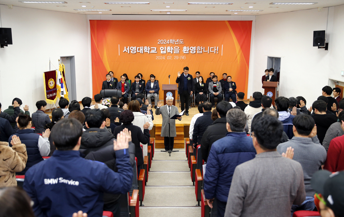 ○ 우리대학(총장 김정수)은 2월 29일(목) '2024학년도 서영대학교 입학식'을 개최하였다. 서영대학교 서강홀에서 진행된 입학식에는 김순곤 부총장을 비롯하여 학교관계자와 교직원 등 내빈과 신입생 및 신입생을 축하해주기 위한 축하객이 참석하였다. 이날 진행된 입학식에는 보다 많은 신입생들의 입학을 축하하고 기념할 수 있는 자리를 마련하기 위하여 주간반 신입생을 위한 주간입학식과 야간반 신입생을 위한 야간입학식으로 총 2차례에 걸쳐 행사를 진행하였다.