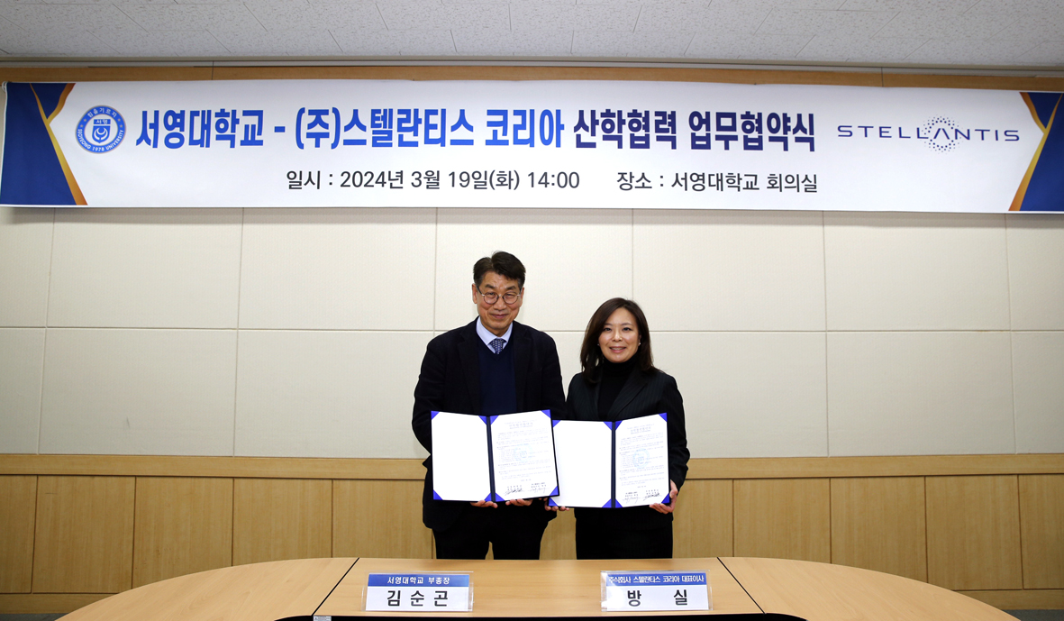 O. 우리대학(총장 김정수)은 3월19일(화) 주식회사 스텔란티스코리아(대표이사 방실)와 자동차 신산업 발전 및 우수 인재육성 사업추진을 위한 업무협약을 체결하였다. 서영대학교 회의실에서 진행된 협약식은 서영대학교 부총장 김순곤, 입학홍보처장 장철인, 학생취업처장 김명재 외 서영대학교 관계자와 주식회사 스텔란티스 코리아 대표이사 방실 외 주식회사 스텔란티스 코리아 관계자 15명이 참석하였다.