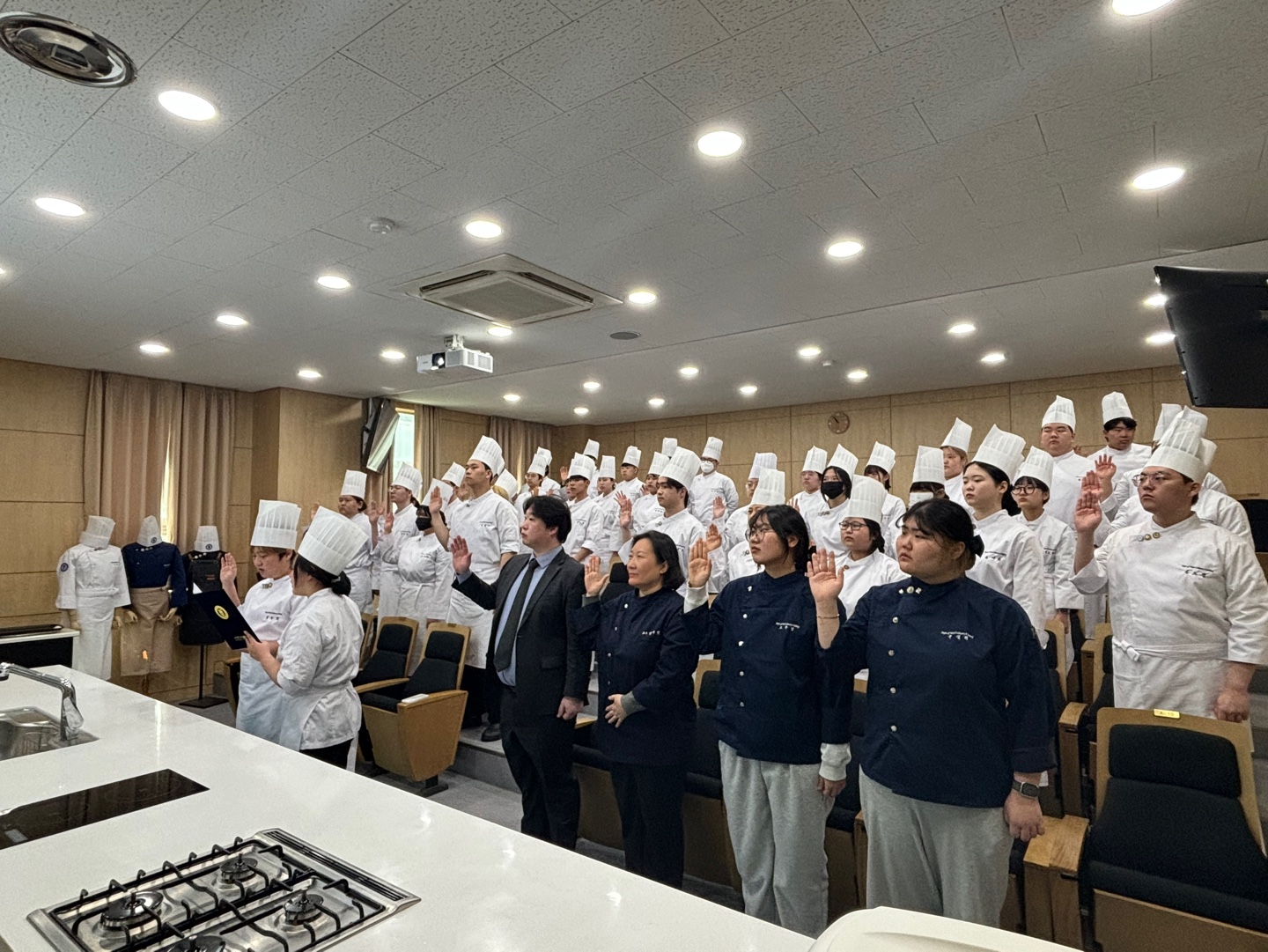 ○ 이번 행사는 올해 신입생 65명 전원이 본인의 학과 유니폼에 대학마크와 학과배지를 부착한 후 외식산업을 주도하는 미래의 셰프로 성장하겠다고 다짐하는 선서식이다.