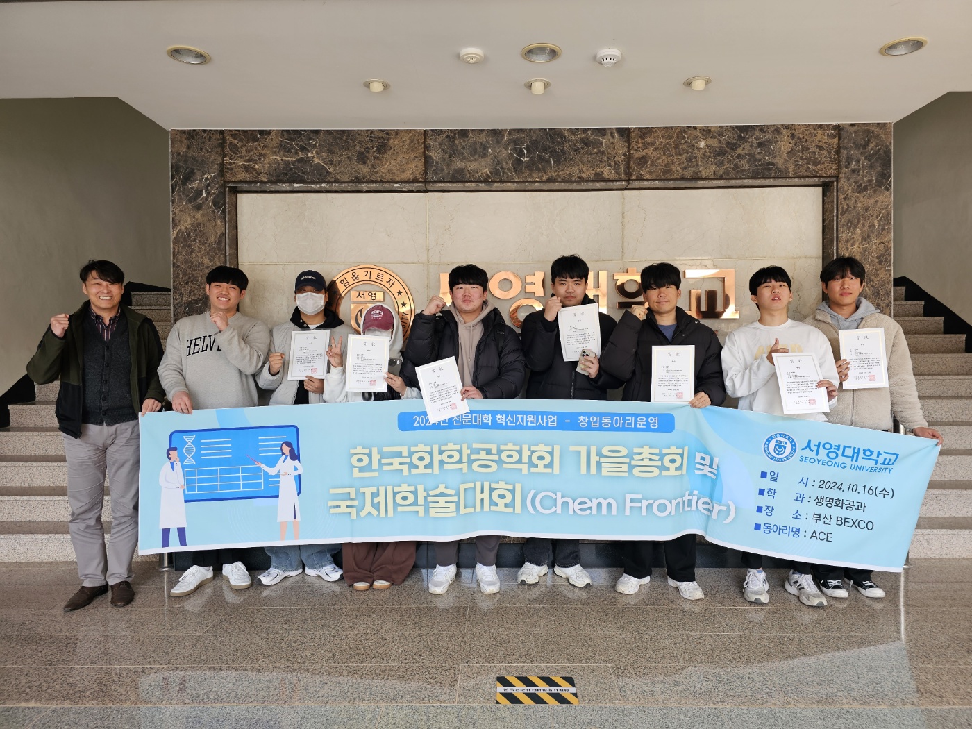 서영대학교는 최근 생명화공과 1학년 창업동아리 학생들이 한국화학공학회 가을총회 및 국제학술대회에서 열린 '2024 Chem Frontier 화학공학 대학생 창의설계 경진대회'에서 동상을 수상했다고 9일 밝혔다.