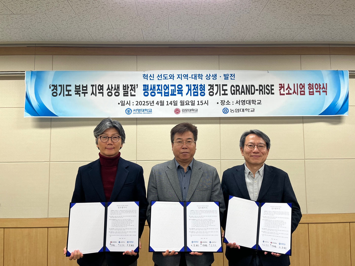O. 우리대학(총장 김정수)414() 김포대학교(총장 박진영), 농협대학교(총장 손병환)와 함께 경기도 서북권 대학 RISE(지역혁신중심 대학지원체계) 컨소시엄 업무협약을 체결하였다. 서영대학교 서정관에서 진행된 협약식에는 서영대학교 봉필준 산학협력부단장과 김포대학교 및 농협대학교 관계자가 참석하였다.