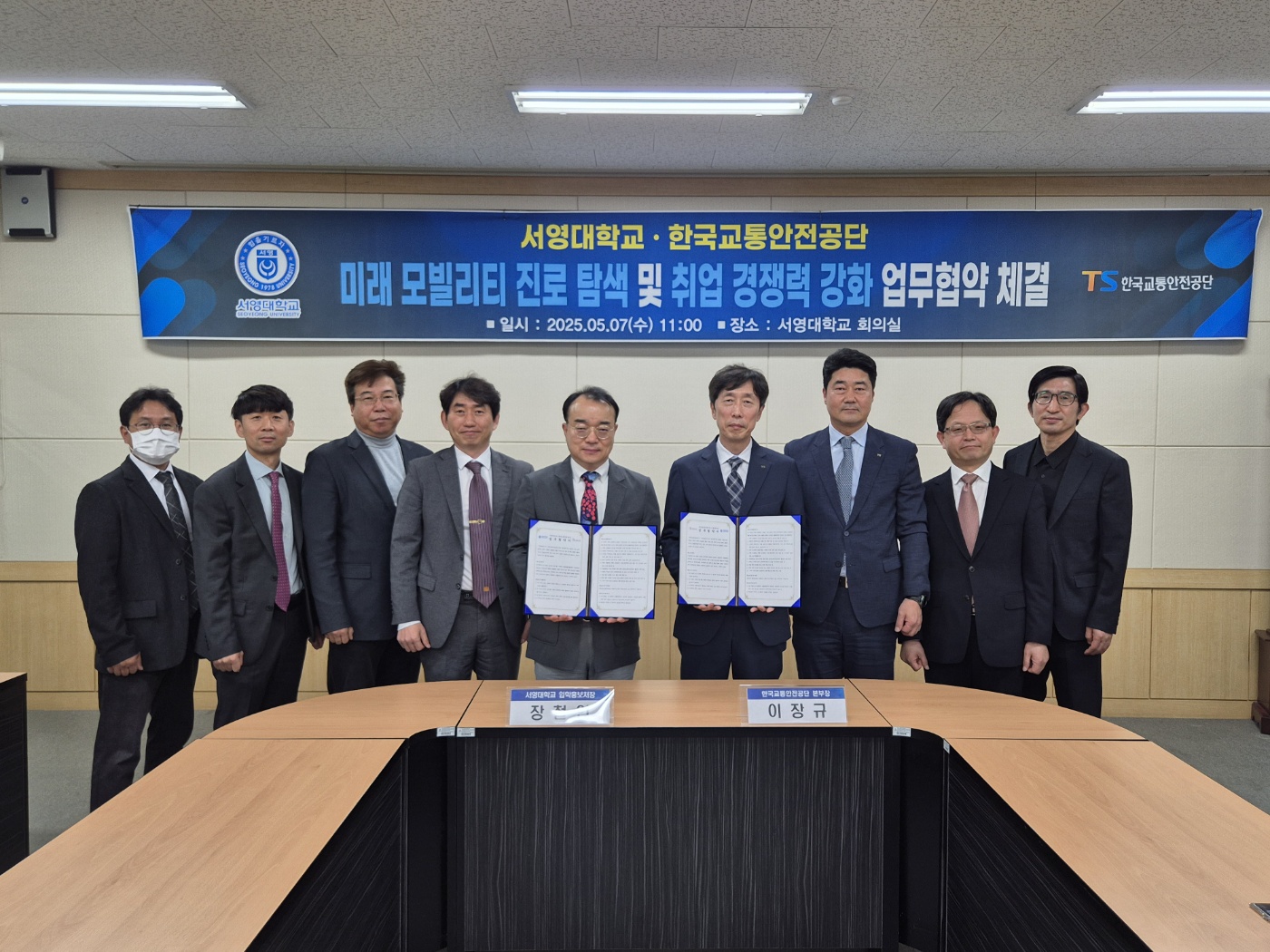 O 우리대학(총장 김정수)은 한국교통안전공단(이사장 정용식)과 미래 자동차 분야의 우수 인재 양성을 위한 산학협력 업무협약을 체결하였다. 5월 7일(수) 서영대학교 회의실에서 진행된 업무협약식에는 장철인 입학홍보처장, 김명재 학생취업처장, 봉필준 산학협력 부단장, 송락현 미래자동차과 학과장, 김진태 교수 등 본교 관계자와 한국교통안전공단 이장규 본부장, 류병의 처장, 김대정 부장, 최재일 차장 등 양 기관 관계자들이 참석하였다.