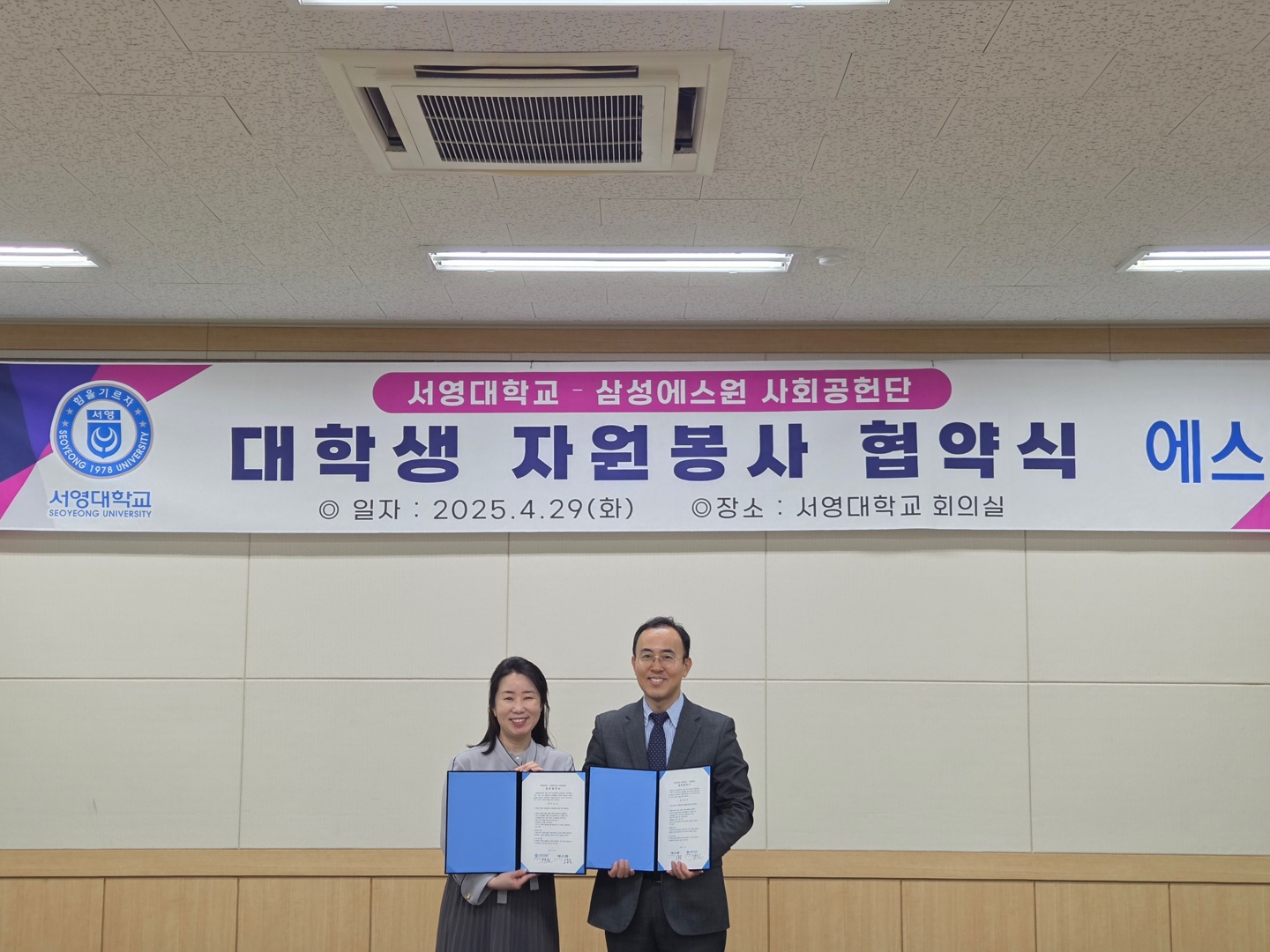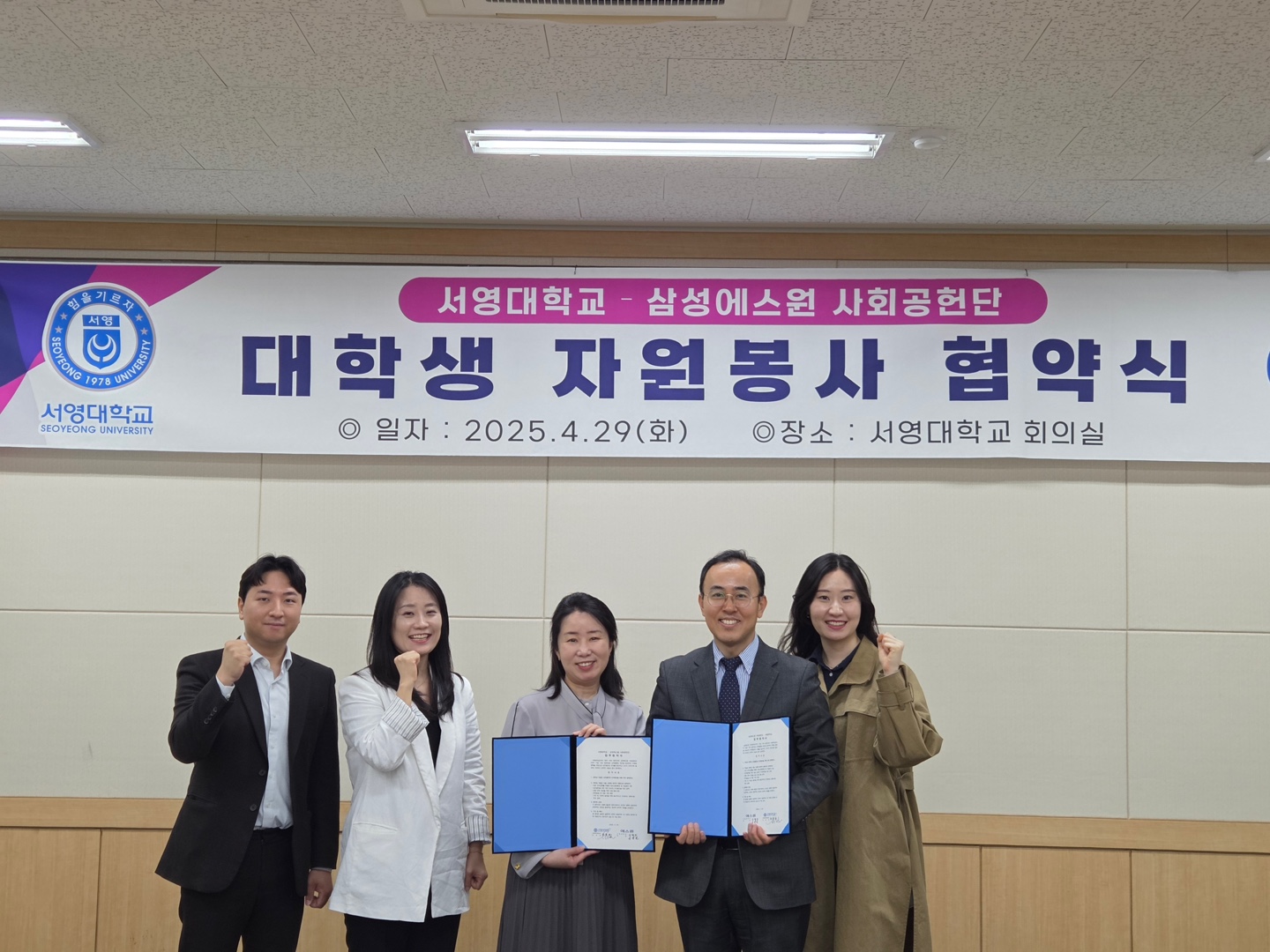 O. 우리대학(총장 김정수사회복지행정과(학과장 김효선)는 사회복지전공 학생들의 전공역량 강화를 위하여 삼성에스원 사회공헌단과의 대학생 자원봉사 협약식을 진행하였다. 서영대학교 회의실에서 진행된 협약식은 사회복지행정과 학과장 김효선교수, 권지혜 교수, 김민철 교수 등 대학 관계자와 삼성에스원 사회공헌단 신영빈 팀장 외 기관 관계자가 참석하였다. 서영대학교-삼성에스원 사회공헌단 대학생 자원봉사 업무협약식은 업무협약 체결, 대학생 자원봉사 발대식 등의 순서로 진행되었다.