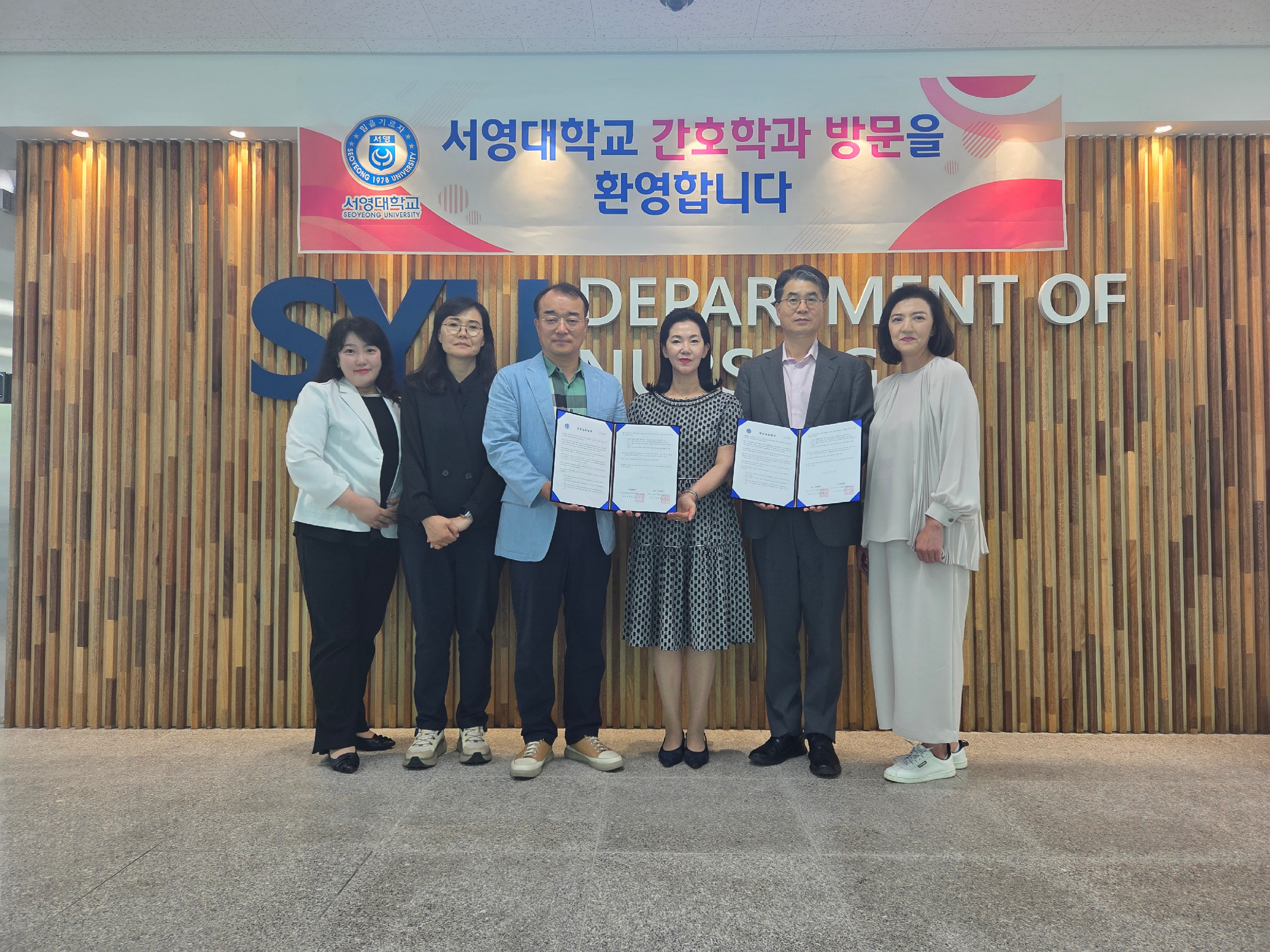 O. 서영대학교(총장 김정수) 간호학과(학과장 이연희)는 6월 20일(금) 인본병원(병원장 김상범)과 산학협력 및 업무 협약을 체결하였다. 서영대학교 간호학과 회의실에서 진행된 협약식은 서영대학교 장철인 입학홍보처장, 이연희 간호학과 학과장, 홍희정 교수, 구소연 교수와 운정 인본병원 이영진 행정원장, 전연실 간호부장이 참석하였다.