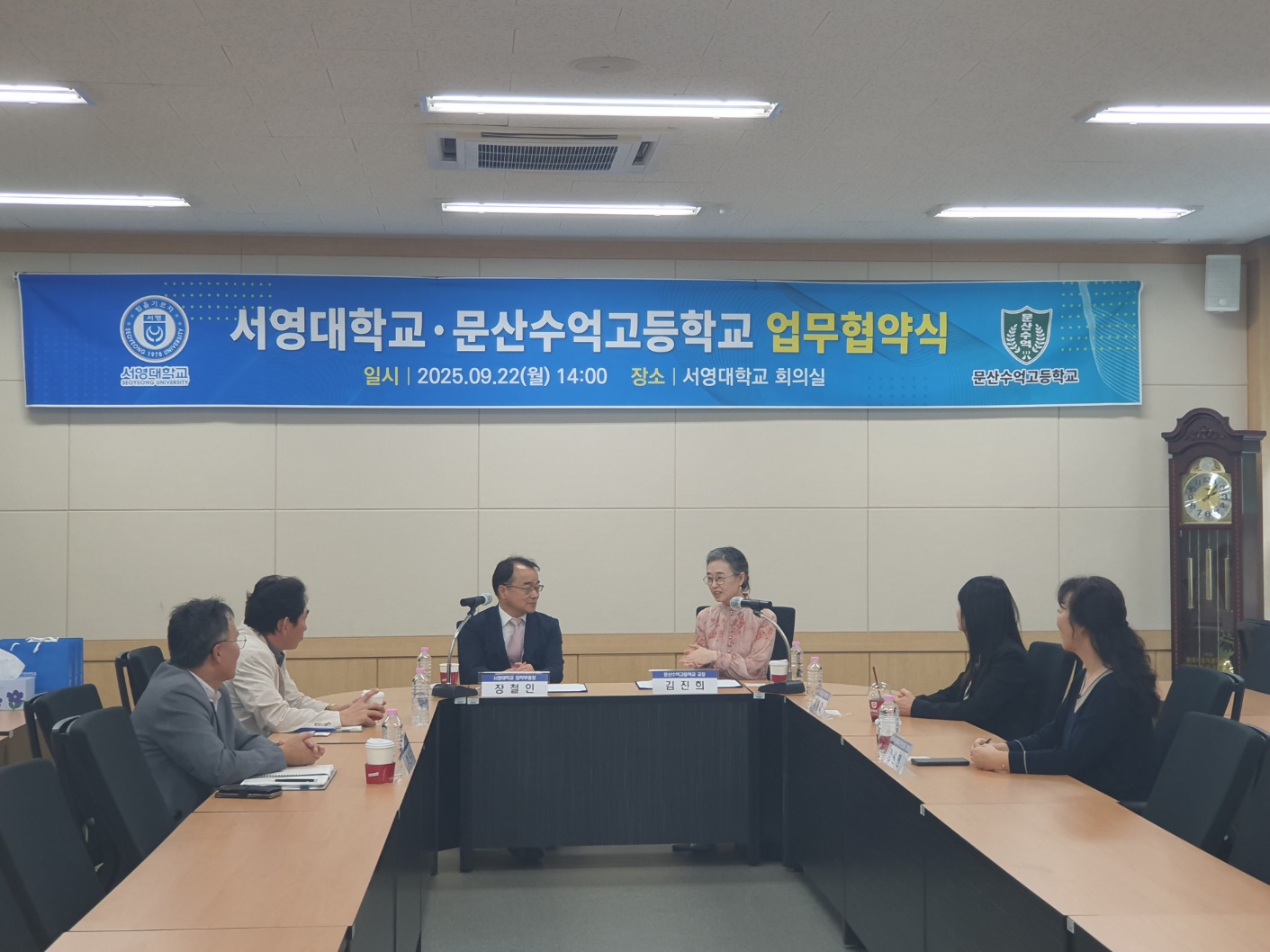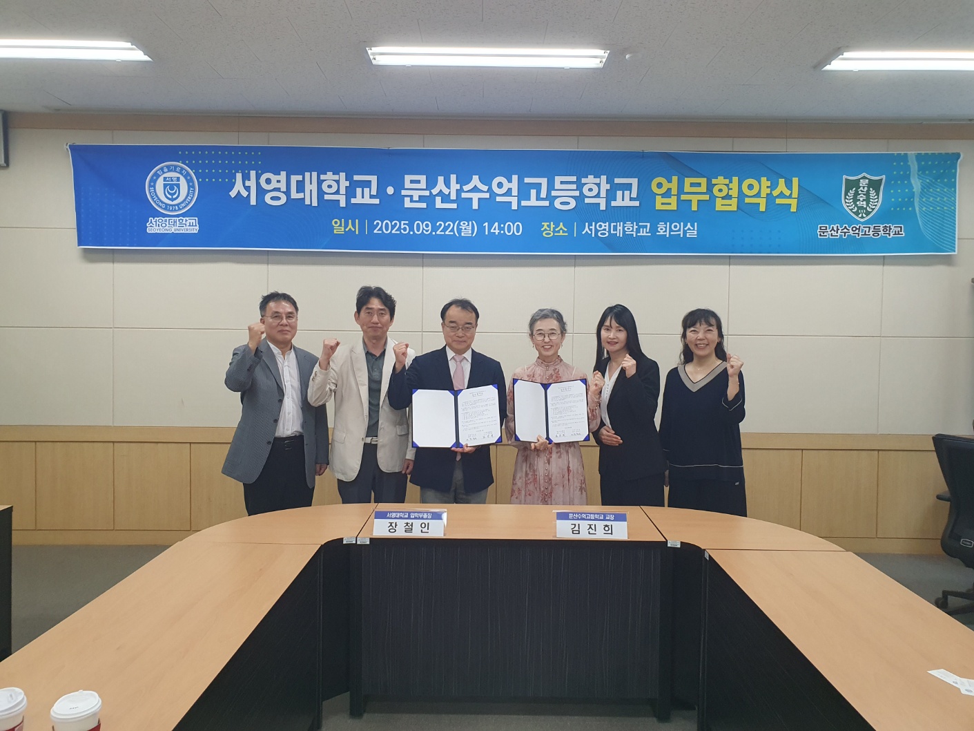 O. 서영대학교 파주캠퍼스(총장 김정수)는 9월 22일(월) 문산수억고등학교와 지역사회 발전과 우수 인재 육성을 위한 업무협약을 체결하였다. 서영대학교 회의실에서 진행된 협약식에는 서영대학교 장철인 입학부총장, 김명재 학생취업처장 외 서영대학교 관계자와 문산수억고등학교 김진희 교장, 김영미 진로부장, 김선인 진로상담부 교사가 참여하였다.